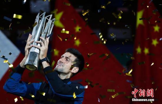 资料图,小德第四次夺得上海网球大师赛的冠军。图为德约科维奇高举奖杯。汤彦俊 摄