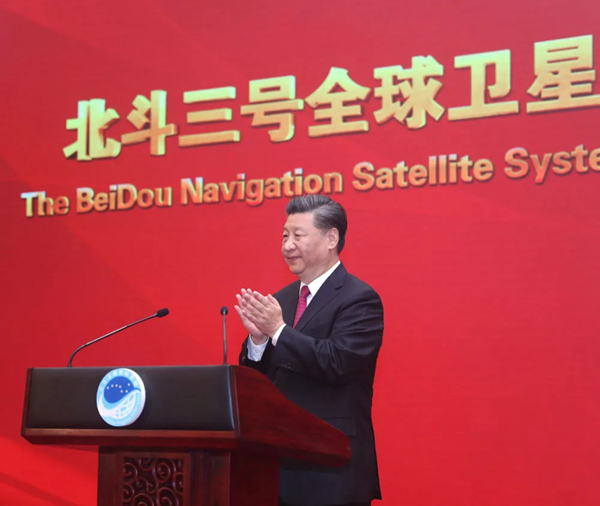 2020年7月31日上午,北斗三号全球卫星导航系统建成暨开通仪式在北京举行。中共中央总书记、国家主席、中央军委主席习近平出席仪式,宣布北斗三号全球卫星导航系统正式开通。新华社记者 鞠鹏 摄