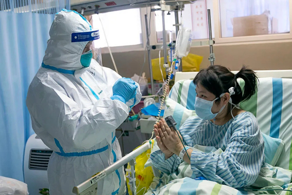 2020年1月24日,在湖北省武汉大学中南医院重症隔离病房,中南医院重症医学科主任彭志勇(左)与病情好转的患者黄淑丽互道新春快乐。新华社记者 熊琦 摄