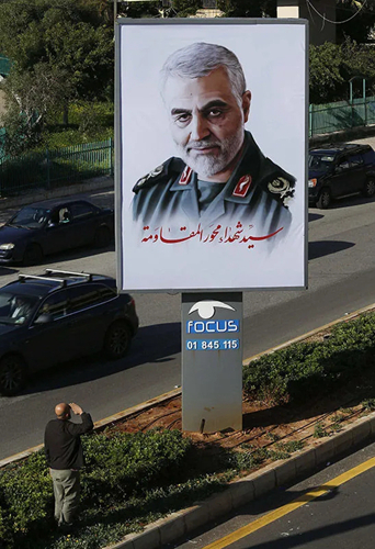 2020年1月6日,在黎巴嫩首都贝鲁特,一名男子向在美国空袭中被炸身亡的伊朗伊斯兰革命卫队将领苏莱曼尼的肖像敬礼。新华社发(比拉尔·贾维希摄)