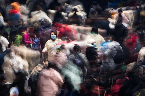 2020年1月22日,在湖北省武汉市汉口火车站,旅客戴口罩进站乘车。1月23日,武汉宣布暂时关闭离汉通道,在全国鼎力支持下,进入“隔一座城、护一国人”的攻坚阶段。新华社记者 肖艺九 摄
