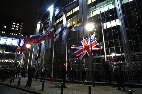 2020年1月31日,在比利时布鲁塞尔的欧洲议会外,工作人员降下英国国旗。布鲁塞尔当地时间1月31日24时(英国时间1月31日23时),英国正式脱离欧盟。新华社记者 郑焕松 摄