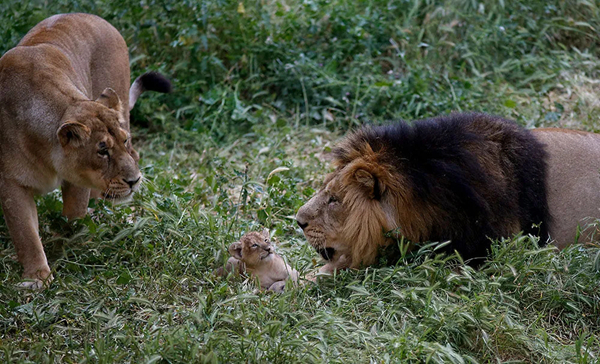 2020年5月7日,在耶路撒冷的动物园内,一只亚洲狮宝宝和父母在一起。新华社发(吉尔·科恩·马根摄)
