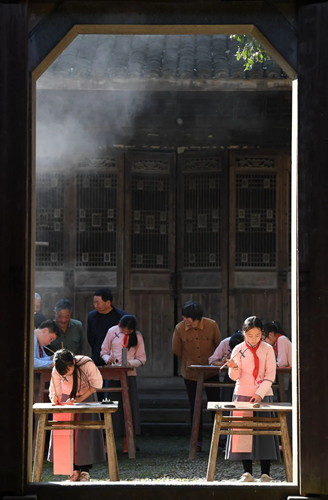 2020年1月7日,新春临近,浙江诸暨东白湖镇斯宅村村民在千柱屋一处天井内观看斯民小学学生写春联。新华社记者 翁忻旸 摄