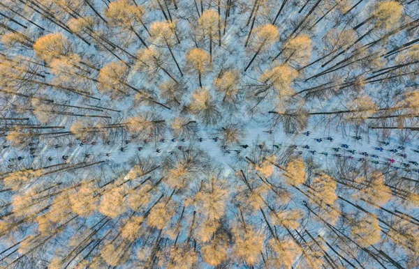 2020年1月4日,参赛选手在2020中国长春净月潭瓦萨国际滑雪节暨2020国际雪联越野滑雪中国巡回赛长春站比赛中(无人机照片)。新华社记者 许畅 摄