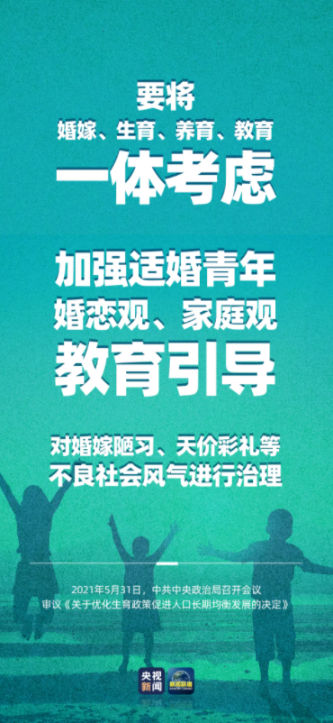 会议指出,党的十八大以来,党中央根据我国人口发展变化形势,先后作出实施单独两孩、全面两孩政策等重大决策部署,取得积极成效。同时,我国人口总量庞大,近年来人口老龄化程度加深。进一步优化生育政策,实施一对夫妻可以生育三个子女政策及配套支持措施,有利于改善我国人口结构、落实积极应对人口老龄化国家战略、保持我国人力资源禀赋优势。