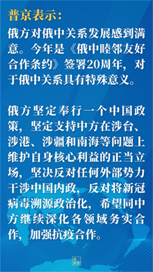 普京表示,俄方对俄中关系发展感到满意。今年是《俄中睦邻友好合作条约》签署20周年,对于俄中关系具有特殊意义。76年前,俄中为取得世界反法西斯战争胜利付出巨大民族牺牲、作出决定性贡献。当前形势下,双方应该密切战略协作,相互坚定支持,捍卫二战胜利成果,维护历史真相。俄方坚定奉行一个中国政策,坚定支持中方在涉台、涉港、涉疆和南海等问题上维护自身核心利益的正当立场,坚决反对任何外部势力干涉中国内政,反对将新冠病毒溯源政治化,希望同中方继续深化各领域务实合作,加强抗疫合作。