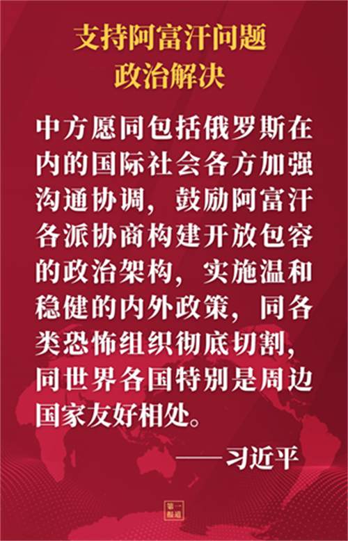 习近平强调,中方尊重阿富汗的主权、独立、领土完整,奉行不干涉阿内政的政策,一直为政治解决阿富汗问题发挥建设性作用。中方愿同包括俄罗斯在内的国际社会各方加强沟通协调,鼓励阿富汗各派协商构建开放包容的政治架构,实施温和稳健的内外政策,同各类恐怖组织彻底切割,同世界各国特别是周边国家友好相处。
