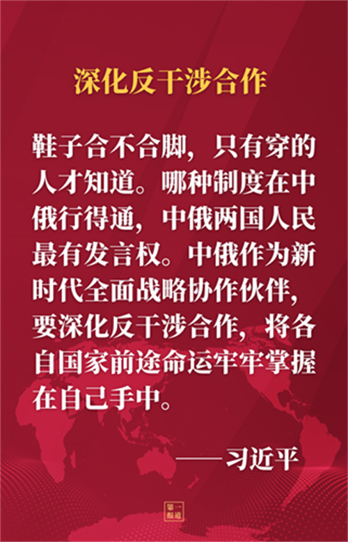 习近平强调,鞋子合不合脚,只有穿的人才知道。哪种制度在中俄行得通,中俄两国人民最有发言权。中俄作为新时代全面战略协作伙伴,要深化反干涉合作,将各自国家前途命运牢牢掌握在自己手中。中方坚定支持俄罗斯走符合本国国情的发展道路,坚定支持俄方为维护国家主权安全所采取的举措。双方要以今年上海合作组织成立20周年为契机,同成员国一道,加强团结协作,加大相互支持,维护地区国家安全和发展利益。
