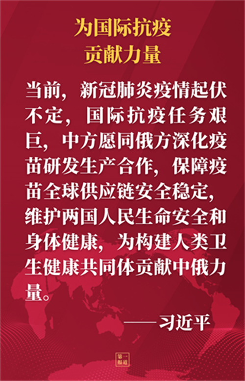 习近平指出,今年以来,中俄以庆祝《中俄睦邻友好合作条约》签署20周年为新起点,推动两国战略协作和全方位务实合作取得一系列新成就,为促进两国各自发展提供了重要支撑,也为团结国际社会共克时艰发挥了中流砥柱作用。双方要创新合作方式,拓展合作领域,争取更多合作成果。当前,新冠肺炎疫情起伏不定,国际抗疫任务艰巨,中方愿同俄方深化疫苗研发生产合作,保障疫苗全球供应链安全稳定,维护两国人民生命安全和身体健康,为构建人类卫生健康共同体贡献中俄力量。