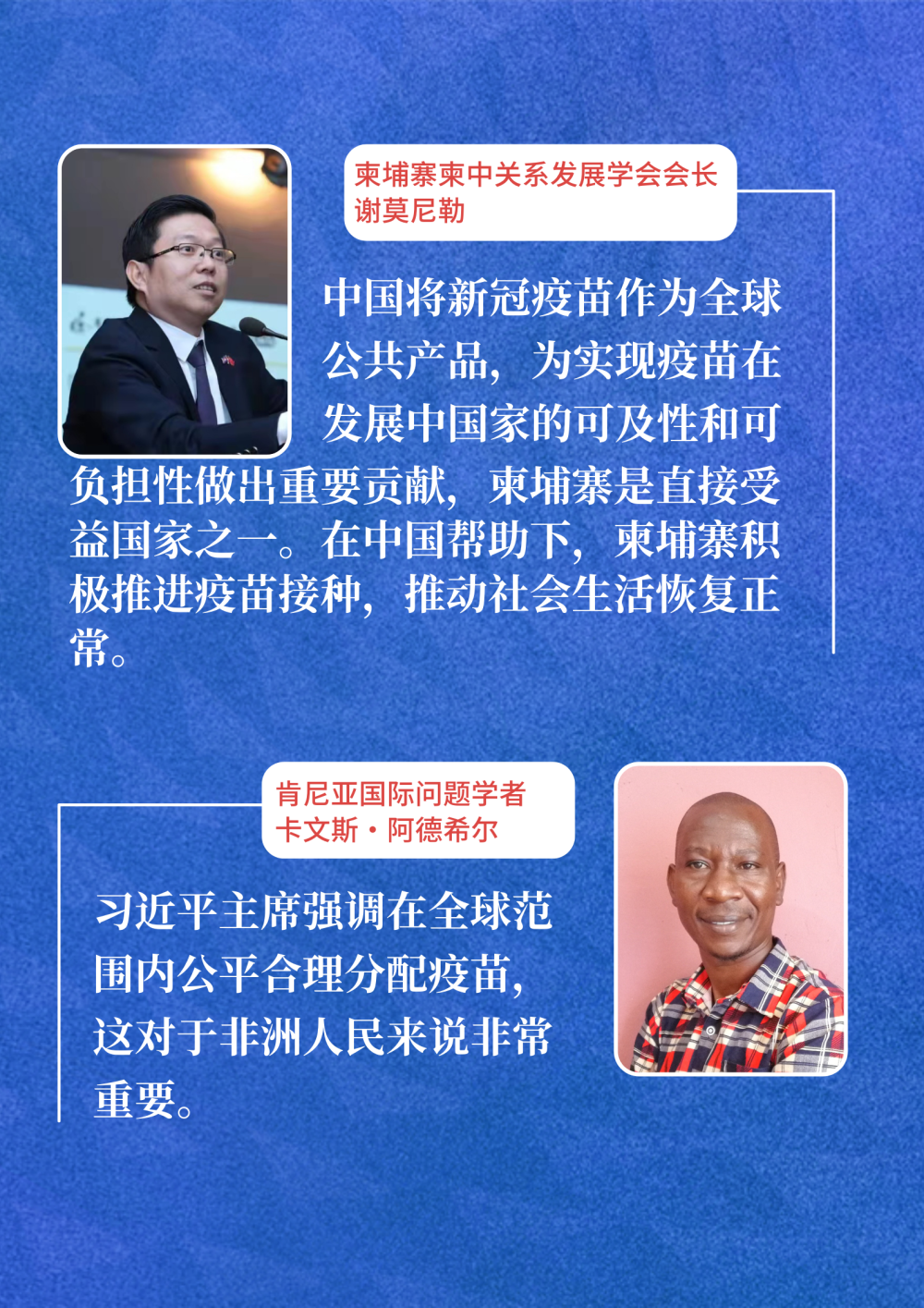 疫苗是战胜疫情的利器。我多次强调,要把疫苗作为全球公共产品,确保发展中国家的可及性和可负担性,当务之急是要在全球范围内公平合理分配疫苗。中国将努力全年对外提供20亿剂疫苗,在向“新冠疫苗实施计划”捐赠1亿美元基础上,年内再向发展中国家无偿捐赠1亿剂疫苗。中国将继续支持和参与全球科学溯源,坚决反对任何形式的政治操弄。