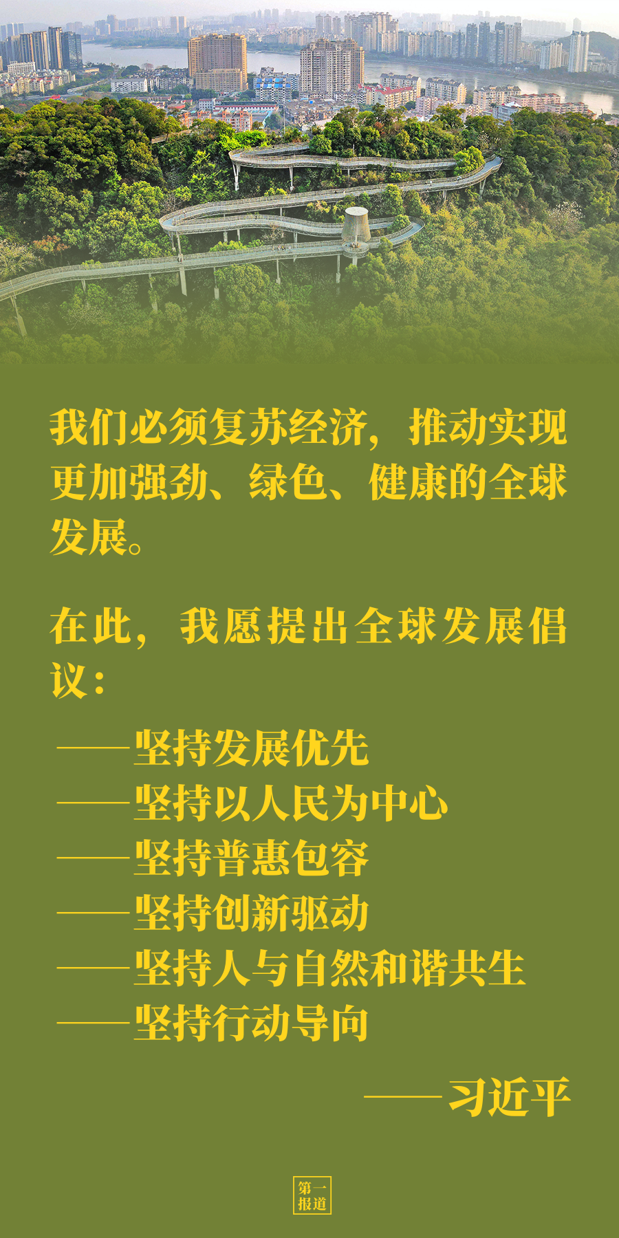 第二,我们必须复苏经济,推动实现更加强劲、绿色、健康的全球发展。发展是实现人民幸福的关键。面对疫情带来的严重冲击,我们要共同推动全球发展迈向平衡协调包容新阶段。在此,我愿提出全球发展倡议: