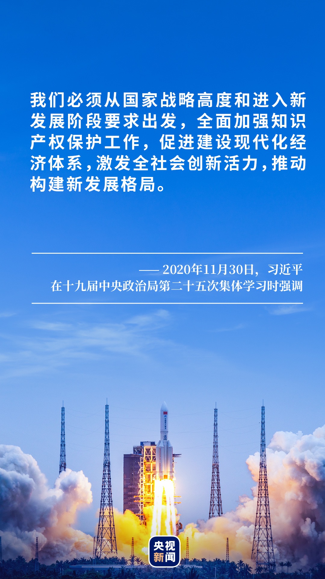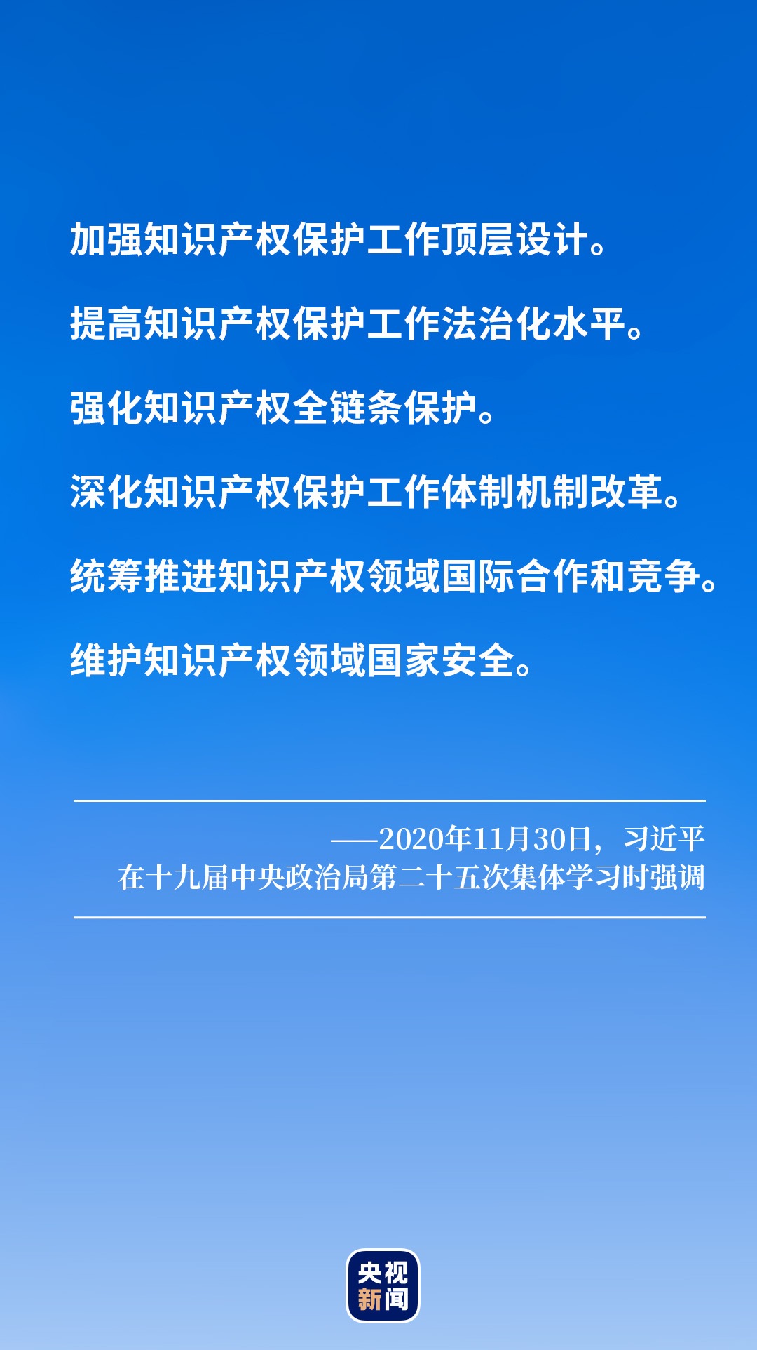 2020年11月30日,党的十九届五中全会之后中央政治局举办第一次集体学习,主题就是加强我国知识产权保护工作。习近平总书记从国家战略高度和进入新发展阶段要求出发,对全面加强知识产权保护工作提出具体要求。