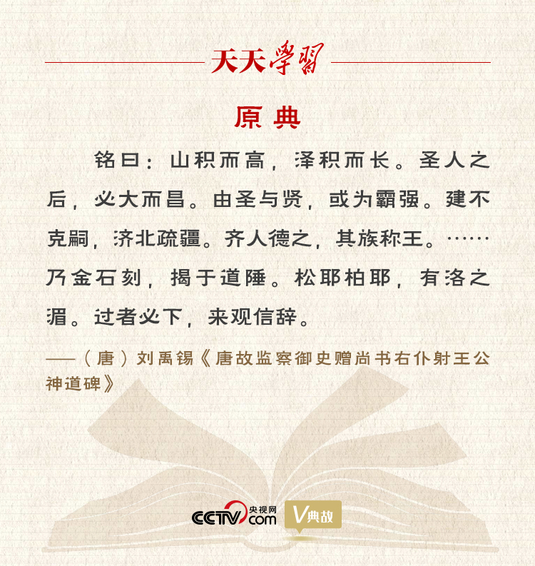 《唐故监察御史赠尚书右仆射王公神道碑》为唐代诗人刘禹锡所撰,碑主为王俊,碑文中有韵的部分为铭文。“山积而高,泽积而长”出自该碑铭文起首,采用了比兴手法。意思是,山是由土石日积月累才高耸起来的,水是由点滴积聚才长流不断的。两个“积”字,突出了量变的作用。不断积累,山可高,水可长,点滴努力,铸就成功。