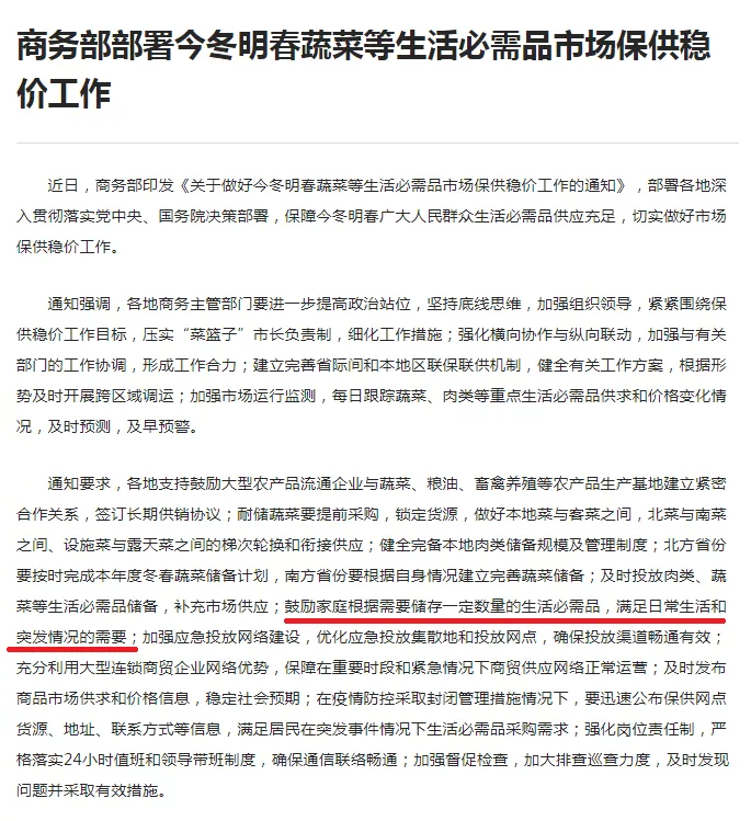 商务部印发的《关于做好今冬明春蔬菜等生活必需品市场保供稳价工作的通知》中提到,“鼓励家庭根据需要储存一定数量的生活必需品,满足日常生活和突发情况的需要”。引出网友各种猜测,引起热切讨论。