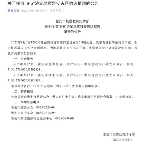 四川雅安市石棉县等地灾情严重,决定面向全社会接收救灾捐助: