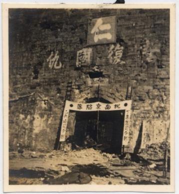 相册中日军在南京中华门悬挂“祝南京陷落”等标语的照片。受访单位供图