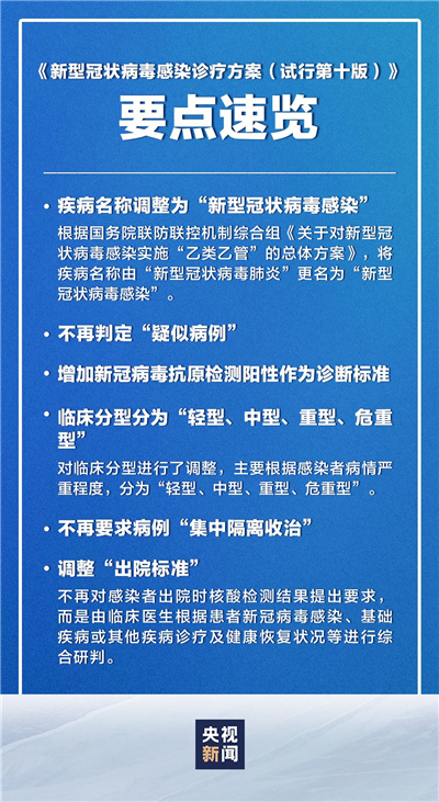 近日,国家卫生健康委会同国家中医药管理局组织对《新型冠状病毒肺炎诊疗方案(试行第九版)》进行了修订,形成了《新型冠状病毒感染诊疗方案(试行第十版)》。重点修订内容如下: