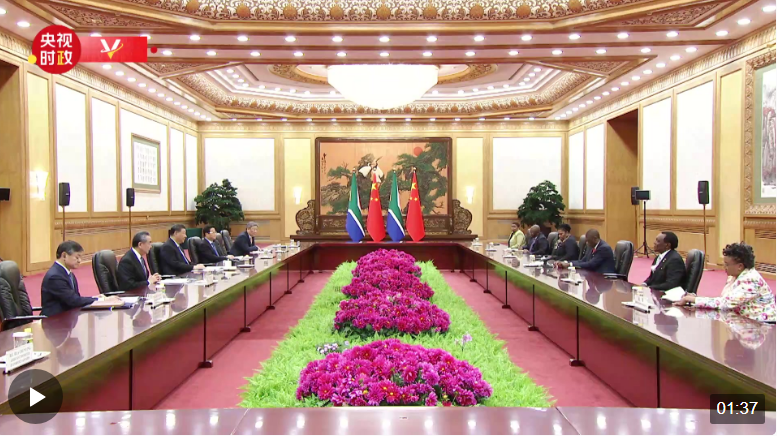 习近平指出,今年8月,我成功对南非进行第四次国事访问,受到贵国政府的热情友好接待,当时的情景至今历历在目。今年是中南建交25周年,两国关系已经步入“黄金时代”。中方愿同南非一道努力,不断充实中南全面战略伙伴关系内涵,推动两国关系再上新台阶。