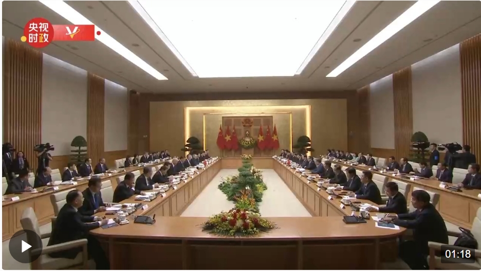 当前,中越关系持续向好发展。昨天,我同阮富仲总书记一道见证双方签署的合作文件,涵盖了两党两国合作的方方面面,充分说明中越关系的广度和深度非同一般。我同阮富仲总书记一道宣布构建具有战略意义的中越命运共同体,开启了新时代中越关系新篇章,相信将为两国人民带来更大福祉,为地区和世界和平、稳定、发展作出积极贡献。