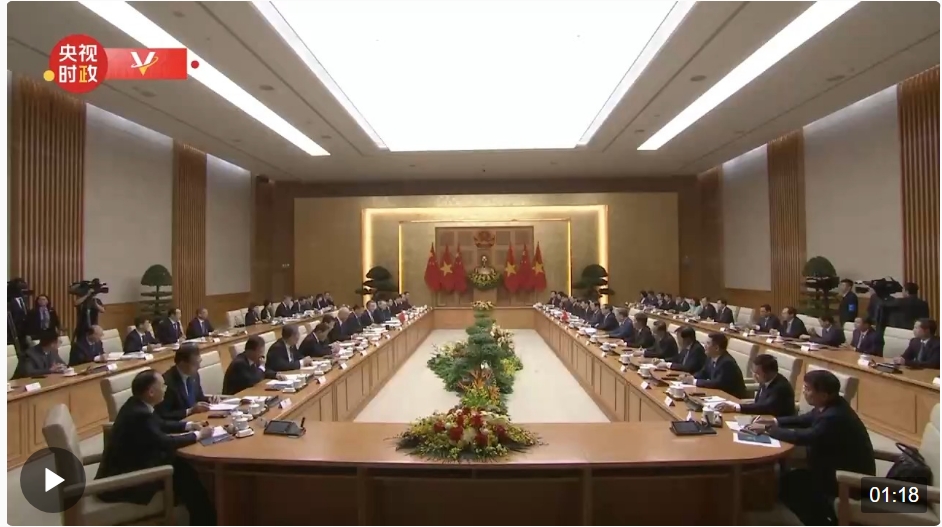 当前,中越关系持续向好发展。昨天,我同阮富仲总书记一道见证双方签署的合作文件,涵盖了两党两国合作的方方面面,充分说明中越关系的广度和深度非同一般。我同阮富仲总书记一道宣布构建具有战略意义的中越命运共同体,开启了新时代中越关系新篇章,相信将为两国人民带来更大福祉,为地区和世界和平、稳定、发展作出积极贡献。