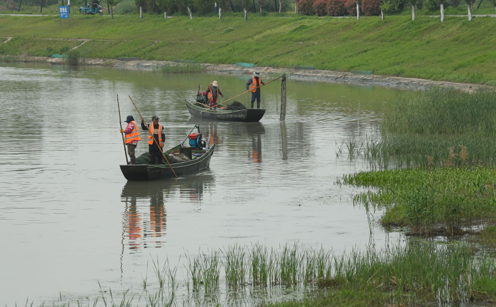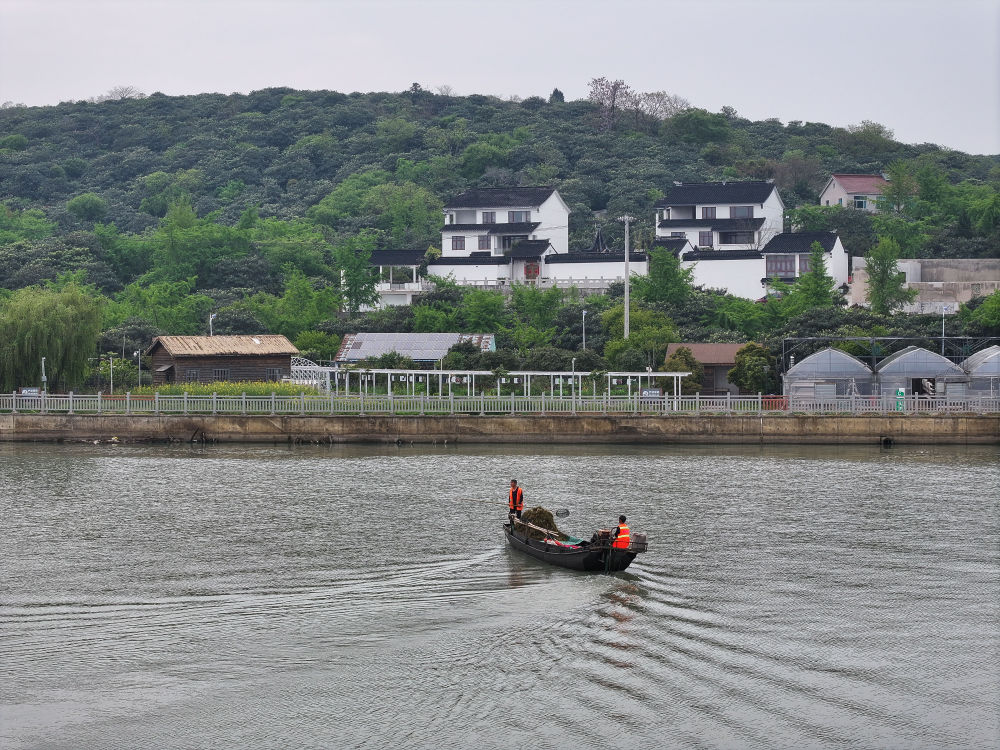 2024年4月11日,江苏省苏州市吴中区金庭水利水务管理服务站的工作人员(退捕渔民)在太湖上打捞漂浮物(无人机照片)。2020年,为保护太湖水生生物资源、促进水域生态环境有效改善,金庭镇渔民停止捕捞作业,部分被安置到环卫站、旅游集团就业。