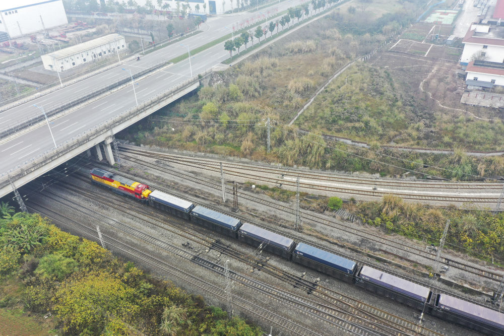 2023年1月22日,一趟西部陆海新通道铁海联运班列从重庆团结村中心站发车(无人机照片)。班列满载着汽车、摩托车、发动机和纯碱等共计100个集装箱的货物,将经广西钦州港换乘海船去往印度尼西亚、菲律宾、喀麦隆、澳大利亚等国家和地区。