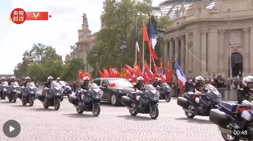 当地时间5月6日下午,欢迎仪式后,习近平主席和夫人彭丽媛在共和国卫队146名骑兵组成的礼兵马队和摩托车队护卫下,乘车前往爱丽舍宫。 RbU安康新闻网