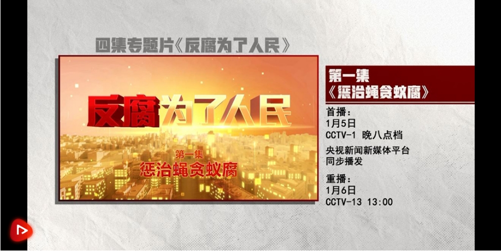 【解说词】《反腐 为了人民》第一集《惩治蝇贪蚁腐》,敬请关注。