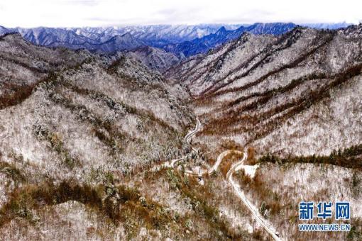 11月5日无人机拍摄的陕西省汉中市佛坪县凉风垭景区雪景。 当日,秦岭初雪,色彩斑斓的秋色在白雪映衬下,美如画卷,置身其间,恍若进入童话世界。 新华社记者陶……