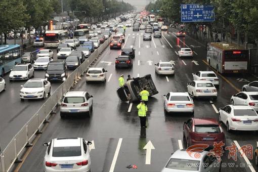 雨天路滑太白南路一轿车侧翻路中间,幸无人员伤亡