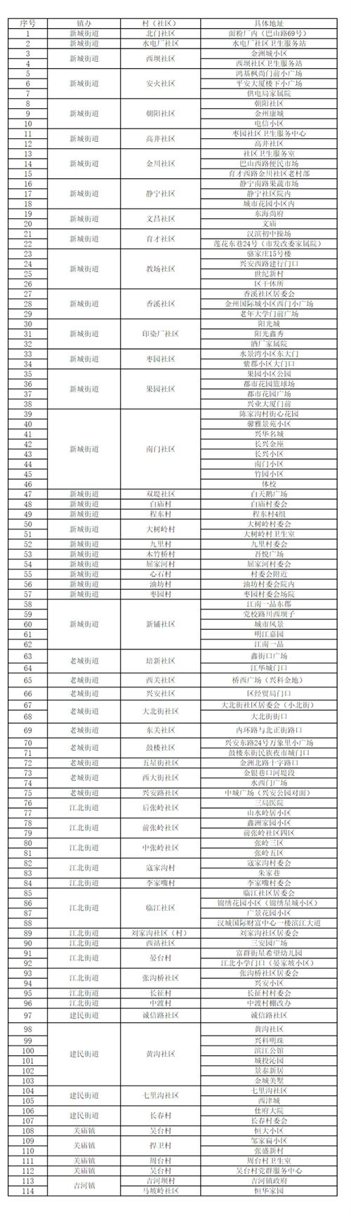 共设置114个采样点(见附件),由各街道、镇政府统一安排采样点设置、人员组织、秩序维护。检测对象按照街道和镇政府要求,分时段有序到指定地点进行采样,避免人员聚集。