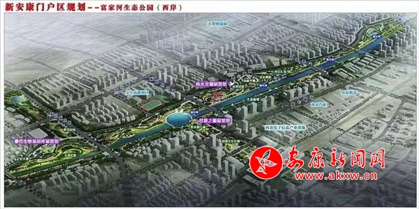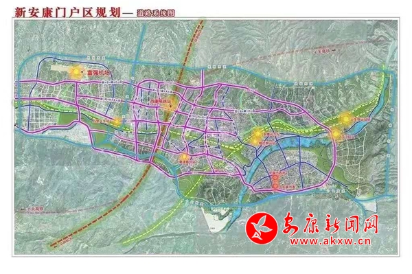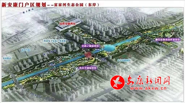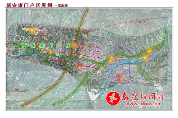 依据总体规划,拟将安康高新区高新大道以西、北环快速干道以南、月河流域以北、寨河梁以东区域的60平方公里,规划为新安康门户区。在空间布局上,以高铁安康西站为核心,以新时代大道、新安康大道、安康大道、创新路4条东西向城市主干道和高新大道、高新七路、高新十路、高新十二路、冉河西路、国宾大道6条南北向城市主干道为轴线,规划布局新经济引领区、临空经济区、新行政中心区、现代服务聚集区、安康特色产业区,以此打造“五大”门户。