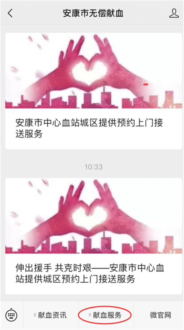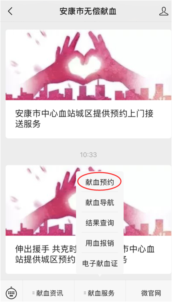 同时安康市中心血站公众号开放献血预约渠道,(如图示)在关注安康市无偿献血公众号后,在最下方菜单栏选择“献血服务”——“献血预约”——填写相关信息,便可完成预约。