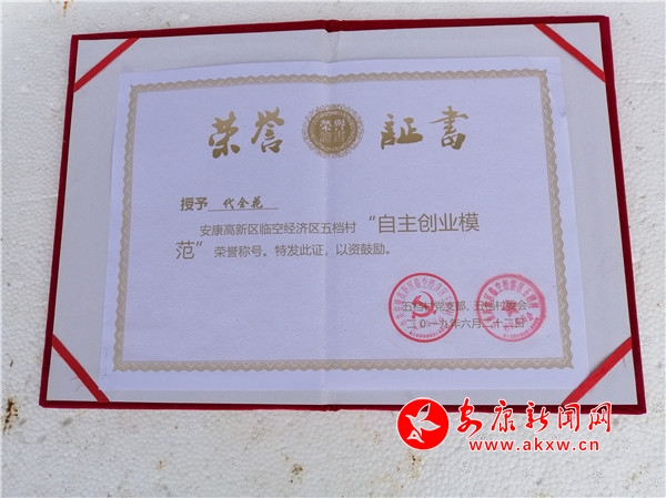 笔者从陈斌口中得知,2019年6月,代全花分别被安康高新区和五档村党支部、村委会授予“自强标兵”和“自主创业模范”荣誉称号,去年一家成功实现了脱贫。