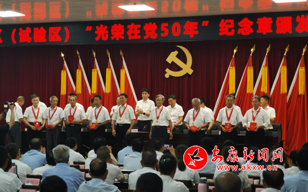 在庆“七一”表彰大会上,全体参会党员面对鲜红的党旗,高举右手,重温入党誓词,铿锵嘹亮的宣誓声响彻会场,激荡人心,昭示着全区党员矢志不渝为党和人民事业不懈奋斗的坚定信念。会上,为高剑村党支部等10个先进基层党组织、王开昌等10名优秀党务工作者、王天苍等20名优秀共产党员代表分别颁发了荣誉证书,为“光荣在党五十年”的10名老党员代表颁发了纪念章。