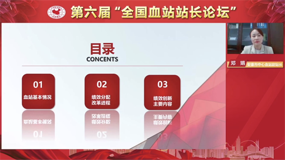 为加强全国血站的经验交流与合作,2021年10月27日至28日,第六届 “全国血站站长论坛”在深圳市举办。中国输血协会理事长、世界卫生组织输血合作中心主任朱永明,深圳市卫健委二级巡视员林汉城等相关领导出席并致辞。此次论坛的主题是“血站建设与发展、改革与创新”,来自全国各省、市血液中心(血站)的同仁通过线上方式参加会议。安康市中心血站副站长邓娟作为全国血站六个优秀论文交流发言人之一,就安康血站绩效分配、改革与创新工作在会上进行了经验交流。