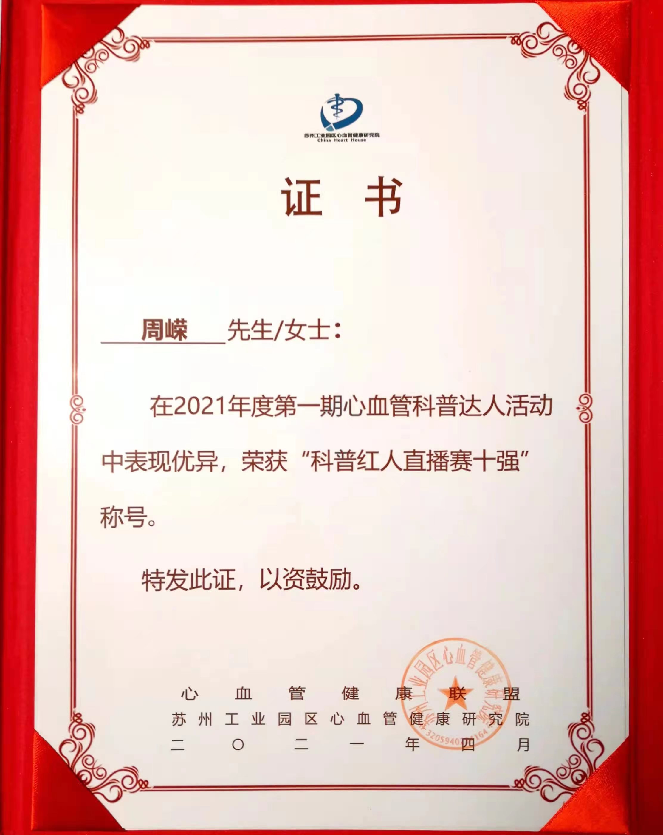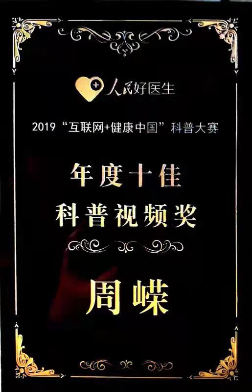 2021年 获医生云奖;获“科普红人直播赛十强”称号