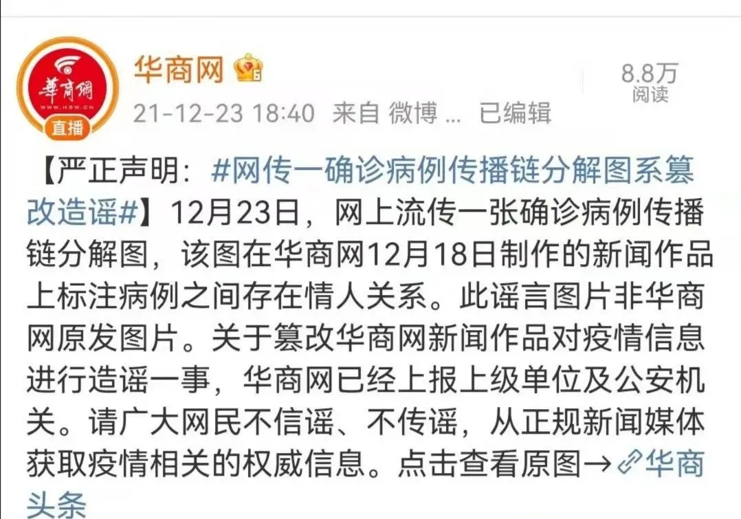 网上流传一张确认病例传播链分解图,在病例之间标注“情人”关系,并传言此次疫情传播因素之一,是因为西安首例病例与子牛门诊的护士为情人关系,导致疫情扩散,经核实,该图盗用华商网12月18日制作的新闻作品图片。该信息为虚假信息,造谣的人已被拘留。
