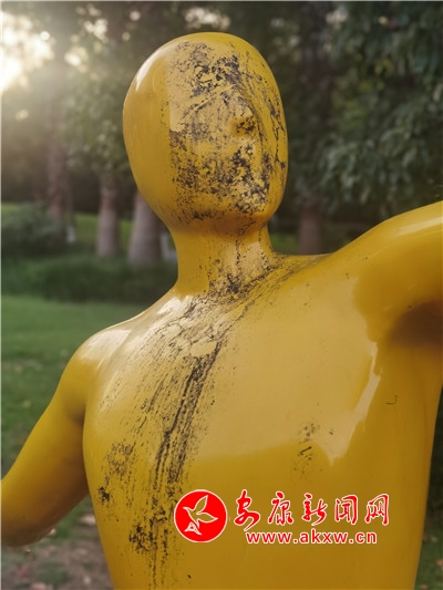 五一期间,安康高新区运动公园内,一处运动塑像遭人“抹黑”,污迹斑斑,有碍观瞻。(记者 许安)
