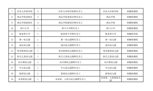 恒口示范区中心城区重点人群:一是党政机关、企事业单位返岗人员、中小学校。幼儿园返校人员;二是“五一”假期有市域外旅居史人员;三是41类重点人群;四是市域外来恒返恒核酸检测结果超过48小时人员;五是愿检人员。