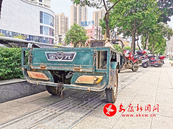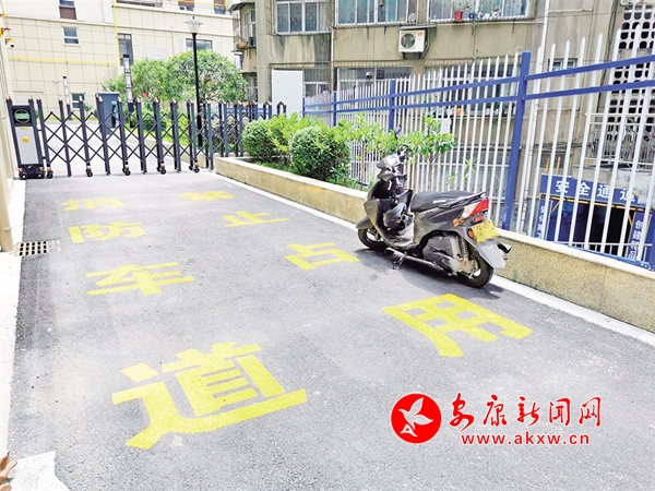 6月22日,安康城区江北江华公司消防通道被摩托车占用(图1),这一区域的人行道盲道也被各种车辆侵占(图2),存在安全隐患。(记者 潘润生 摄)