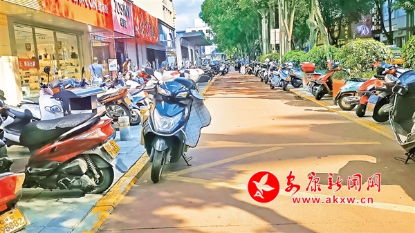 6月23日,金州南路东侧,摩托车、电动车停放在公交港湾,存在安全隐患。(记者 吴单 摄)