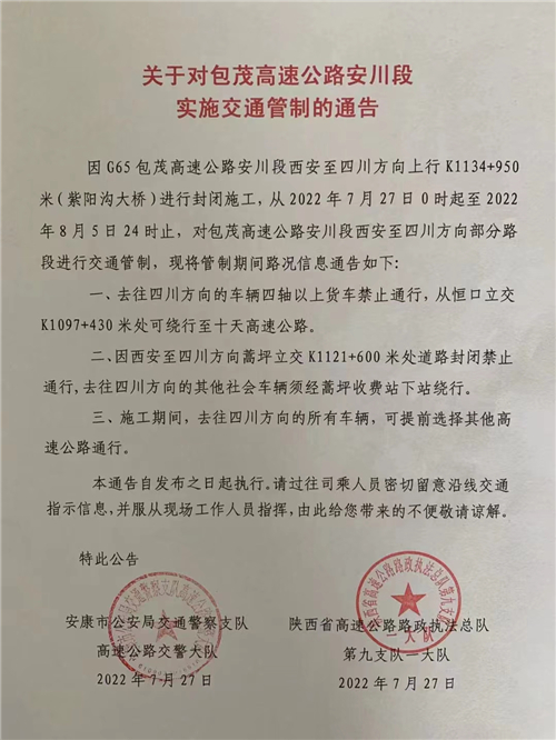 即日起至8月5日 包茂高速公路安川段实施交通管制