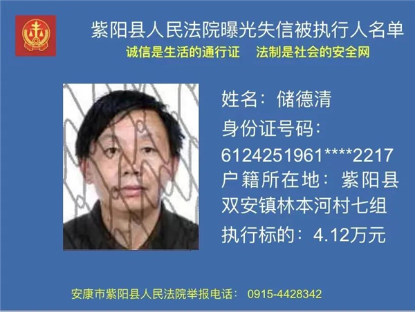 曝光失信 | 紫阳县人民法院:关于敦促储德清履行法定义务的公告