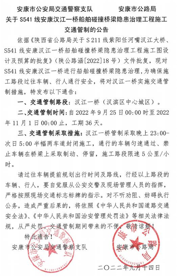 9月25日至11月1日安康汉江一桥将进行船舶碰撞桥梁隐患治理工程施工,将对汉江一桥实行交通管制36天,管制采取晚上23:00-次日5:00半幅两车道封闭施工,通行的车辆匀速通过,禁止车辆在桥梁上采取制动、停留,施工路段限速5公里/小时。