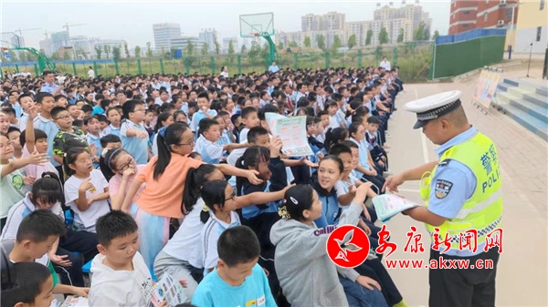 活动中,大队民警结合辖区实际情况,首先通报了暑假期间全区道路交通安全,特别是涉及中小学生的典型事故案例,以身边的事故教育身边的人,以案说法、以案为鉴,希望同学们从中汲取深刻教训,远离交通事故危害。其次,民警针对中小学生上下学出行特点,以“守法规知礼让、安全文明出行”为主题,通过摆放宣传展板、发放宣传资料、以及互动问答等形式,围绕学生正确走路、文明乘车、安全骑车几个方面,向同学们宣传讲解日常交通安全常识,生活中出行应当注意的行为规范,发生交通事故后如何求助,教育引导同学们认真遵守道路交通安全法规,牢固树立交通安全文明意识,做到知危险会避险,守法规知礼让,真正提高安全防范意识和自我保护能力。