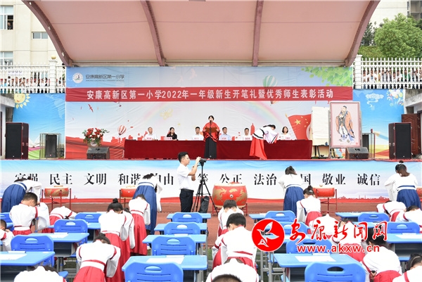 本网讯(通讯员 李晓波)为进一步强化学校未成年人建设,帮助广大儿童“扣好人生第一粒扣子”,9月16日上午,安康高新区第一小学举行“喜迎二十大 一起向未来”一年级开笔礼暨优秀师生表彰大会。