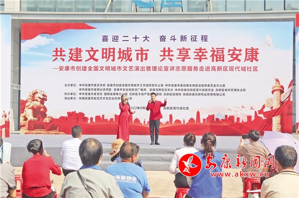 9月9日,一场以“共建文明城市,共享幸福安康”为主题的文艺演出和理论宣讲活动在高新现代城社区举行。整场活动,除了有群众喜闻乐见的文艺节目,还设置有创建知识问答互动和创文知识专题宣讲。现场,志愿者们还热情地向群众发放印有创文内容的宣传册、凉扇、垃圾袋等,大家纷纷赞扬:“形式生动活泼,宣传入脑入心!”