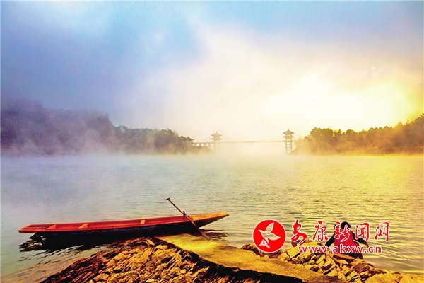 湖抱山,山拥湖,从天柱山上鸟瞰,晨看日出,霞光万道,暮观日落,湖光潋滟,尤其是雨后放晴观云海,轻烟薄雾,缥缈迷离,摇曳于峰之巅,弥漫在宇之殿,疑是凡人撞入九霄。水缥缈无垠,湖光镜面,山绵延有致,翡翠如黛,宛如绿宝石镶嵌。